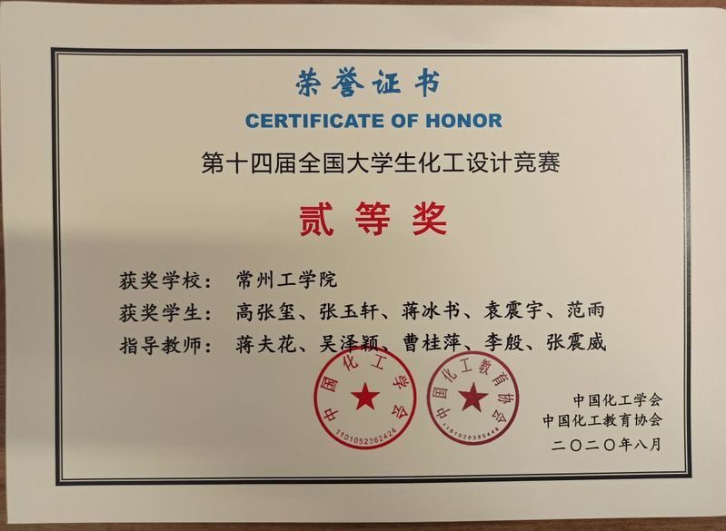 近期,第十四届全国化工设计大赛全国总决赛在合肥工业大学举行。公司bevictor1946韦德官网高张玺、张玉轩、蒋冰书、袁震宇、范雨等五名同学最终在大赛中取得了全国二等奖的佳绩。