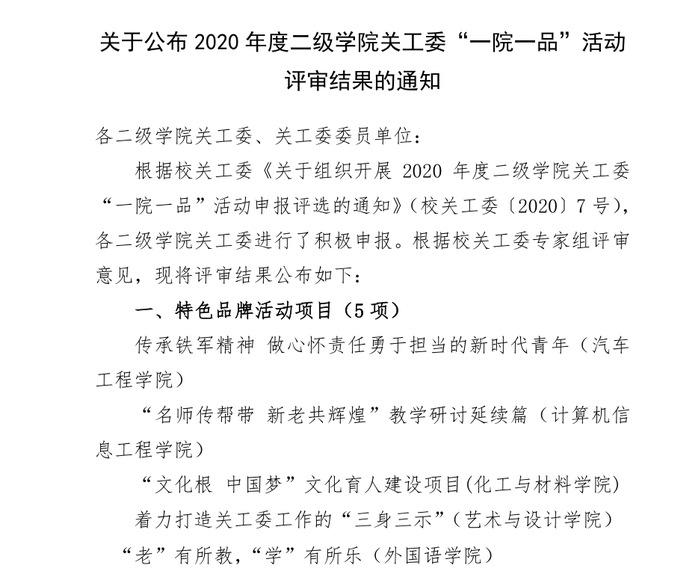 根据校关工委《关于组织开展 2020 年度二级公司关工委“一院一品”活动申报评选的通知》(校关工委〔2020〕7 号),公司进行积极申报、认真谋划,项目《“文化根 中国梦”文化育人建设项目》从众多申请书中脱颖而出,被评选为校特色品牌活动项目。