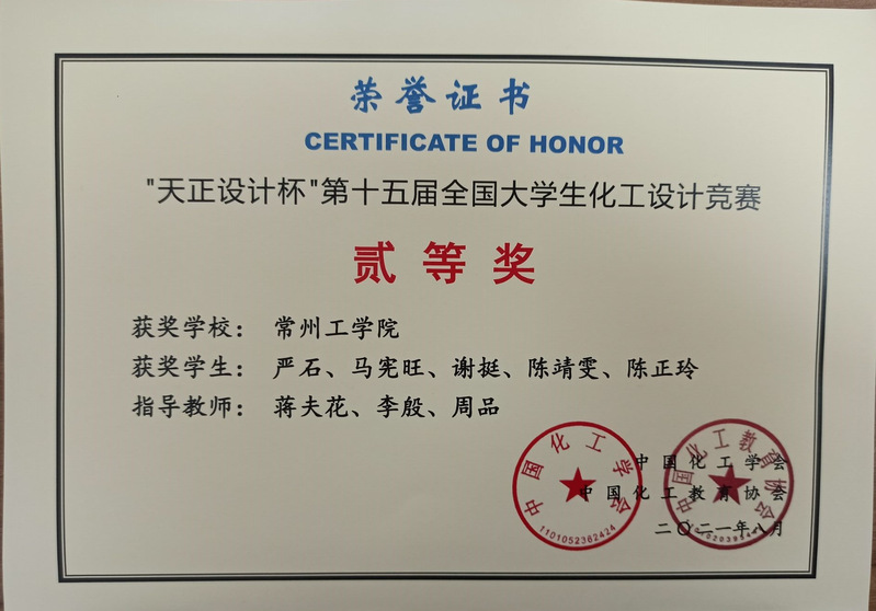 近期,第十届江苏省老员工化工设计竞赛及第十五届全国老员工化工设计竞赛全国总决赛先后在江苏大学、厦门大学举行。公司选送的两支队伍获得江苏省一等奖一项、二等奖一项,其中一支队伍获得全国二等奖。