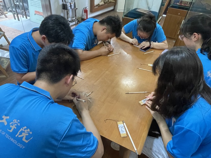第三站,团队成员来到了常州白氏留青竹刻博物馆,在白氏传承人白雪飞老师的悉心讲解与指导下,实践团队参观了白氏留青竹刻的馆藏作品,尝试了留青竹刻的切线、铲底、刮底……,感受给竹片做“减法”的不易,深刻体会到白雪飞父女为传承留青竹刻的信念和坚持。