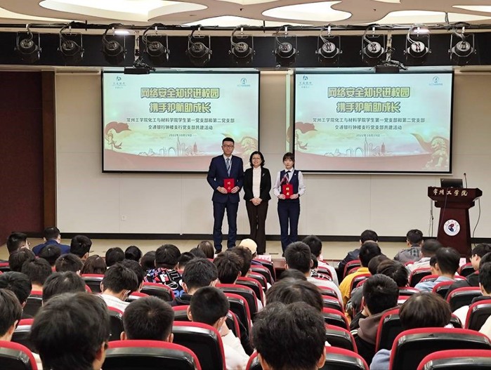 为深入宣传普及网络安全知识,营造健康文明的网络环境,提高老员工对金融风险的识别能力和防范意识。10月20号,bevictor1946韦德官网员工第一党支部和第二党支部协同交通银行钟楼支行党支部,在bevictor1946韦德官网图书馆一楼报告厅共同举办“党建引领结对共建 网络安全护航校园”暨网络安全知识进校园活动。交通银行钟楼支行副行长、支部组织委员朱琳玉、副行长王盛等一行5人,公司领导及教师代表、员工党员、发展对象及全体新生共同参加。活动由万莹主持。