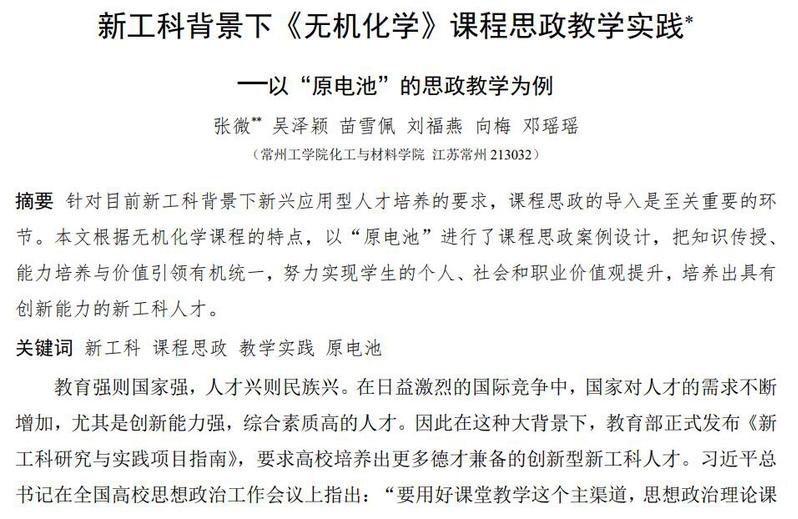 近期,bevictor1946韦德官网张微老师在化学教育类中文核心期刊上以原创研究论文形式投稿了教学研究文章——《新工科背景下<无机化学>课程思政教学实践——以“原电池”的思政教学为例》,该论文已被中文核心期刊《化学教育》录用。该期刊主要围绕化学基础学科,交流教育、教学经验和研究成果,开展关于课程、教材教法、实验技术的讨论,介绍化学和化学教学理论的新成就,报道国内外化学教育改革的进展和动向。
