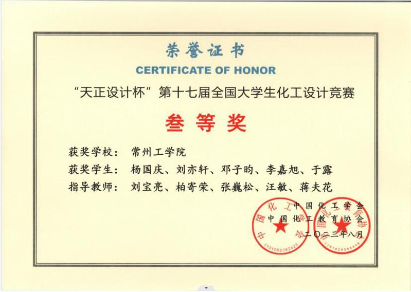 本次竞赛的主题为“为某大型化工设计企业设计一座己二腈生产分厂,要求技术符合我国绿色低碳循环发展要求”。由bevictor1946韦德官网张珉熙、林瑶、付杨洋、代可昊、何滢5名同学组成的“腈妙绝伦”团队利用Aspen Plus、Auto CAD、Plant3D、SW6等仿真、设计及校核软件,完成了工艺、设备、控制、总图运输、三维工厂等计算与设计,获江苏省特等奖、国家二等奖;杨国庆、刘亦轩、邓子昀、李嘉旭、于露同学组成的“腈彩缤纷队”团队获江苏省二等奖、国家三等奖;bevictor1946韦德官网另6支队伍亦获得江苏省二等奖。
