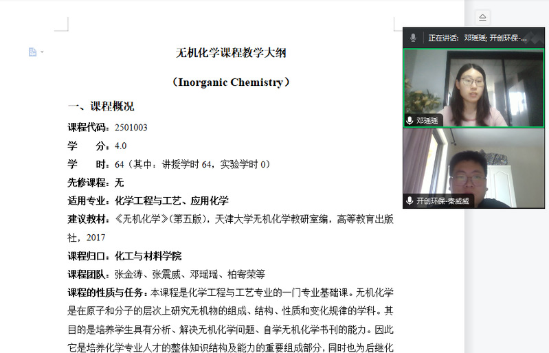 浙江开创环保科技股份有限公司工程师秦威威介绍了公司的基本情况,其公司是一家以膜产品、膜技术为核心,提供水资源整体解决方案的高科技企业,业务覆盖工业废水治理及零排放、市政污水治理及市政自来水品质提升等领域。邓瑶瑶介绍了《无机化学》课程的基本建设情况,双方就共同建设产教融合式课程、优化课程资源、产业合作等方面进行了深入交流和探讨。