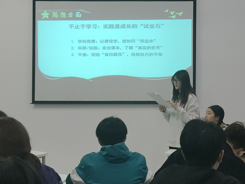 分享会上,韩梦娣结合自身经历,从课程学习、科研竞赛等方面分享了宝贵经验。她强调要合理安排时间,制定清晰的学习计划,积极主动地投身科研竞赛以及社会实践活动,呼吁同学们拒绝“盲目跟风”,走出一条属于自己的道路。谭曦运则从学分绩点、员工干部工作、科研竞赛以及校园活动、志愿服务等方面分享经验及心得,为同学们提升个人能力、规划大学发展路径提供了方向,同时鼓励他们多多尝试,勇于探索适合自己的发展方向。