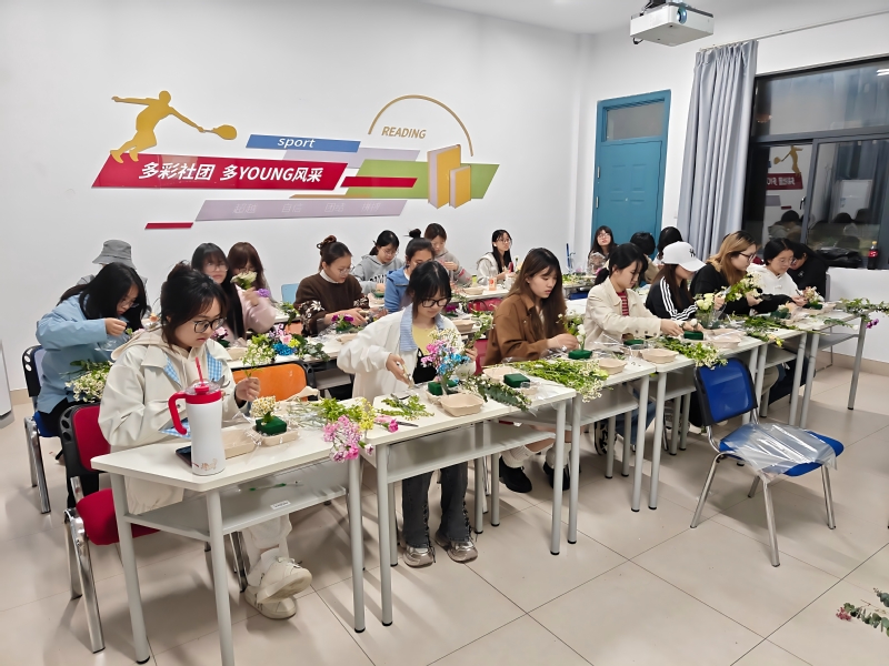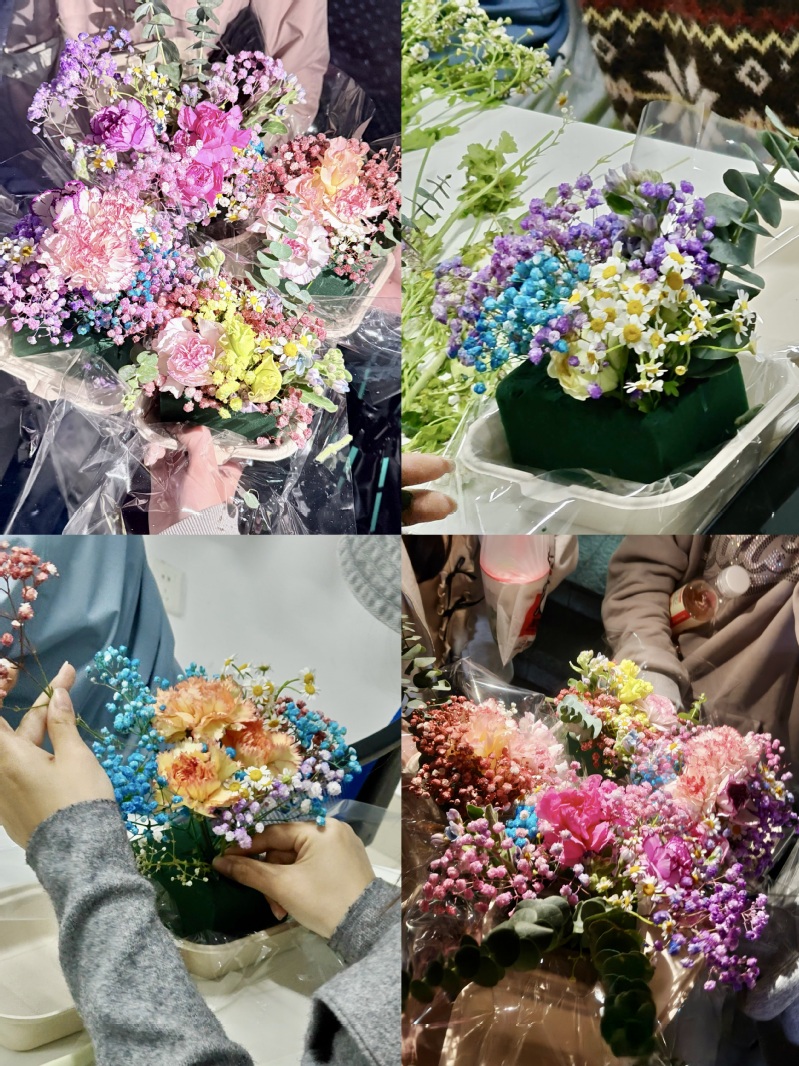 活动在轻柔的背景音乐中拉开帷幕。主持人首先讲解了基础花艺知识、花材搭配技巧及各类花语的寓意,引导同学们初步感受花艺背后的情感价值。随后进入自由DIY环节,同学们随心挑选花材,专注创作,在花香与音乐的陪伴下暂时抛开烦恼,享受当下的宁静。最后,几位同学分享了作品背后的故事与创作感受,现场氛围温馨融洽。
